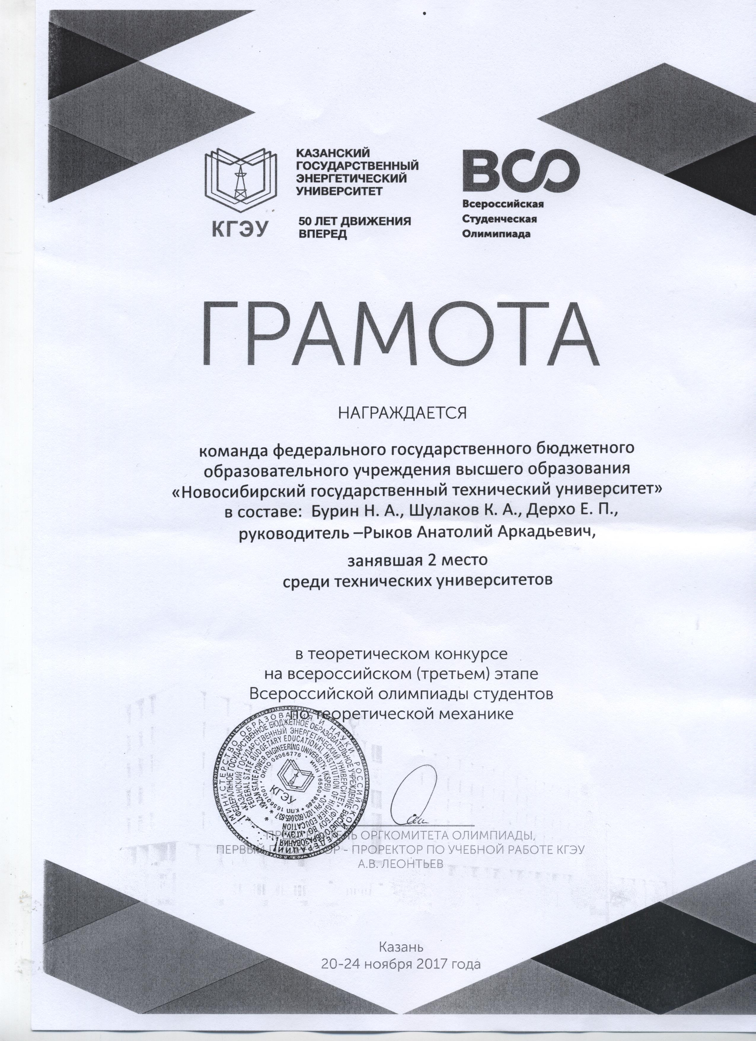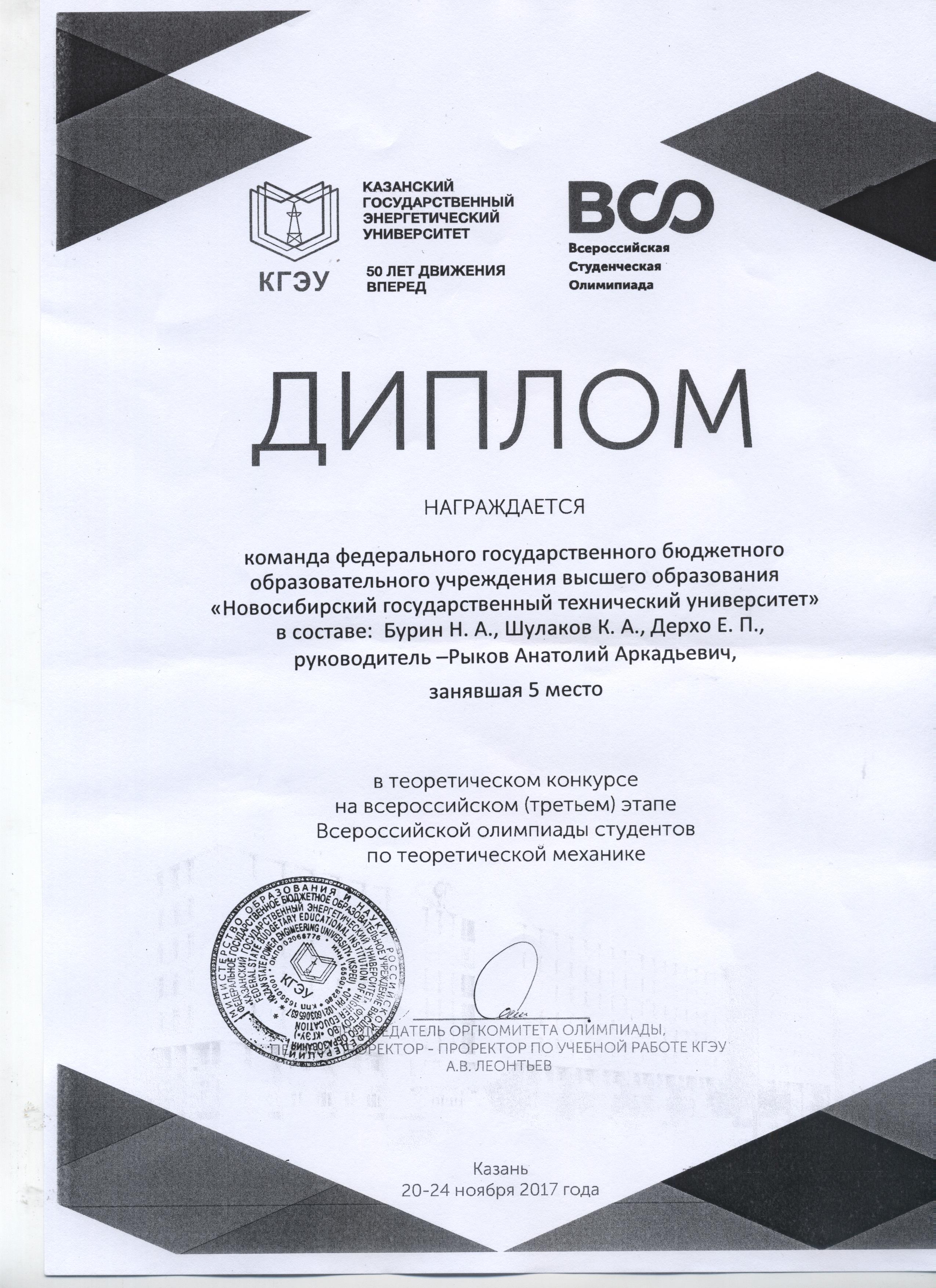 20-24 ноября 2017 года в Казанском государственном энергетическом университете состоялась Всероссийская студенческая олимпиада по теоретической механике. Наша команда заняла 5 место из 36 вузов страны и 2-ое место среди технических вузов.