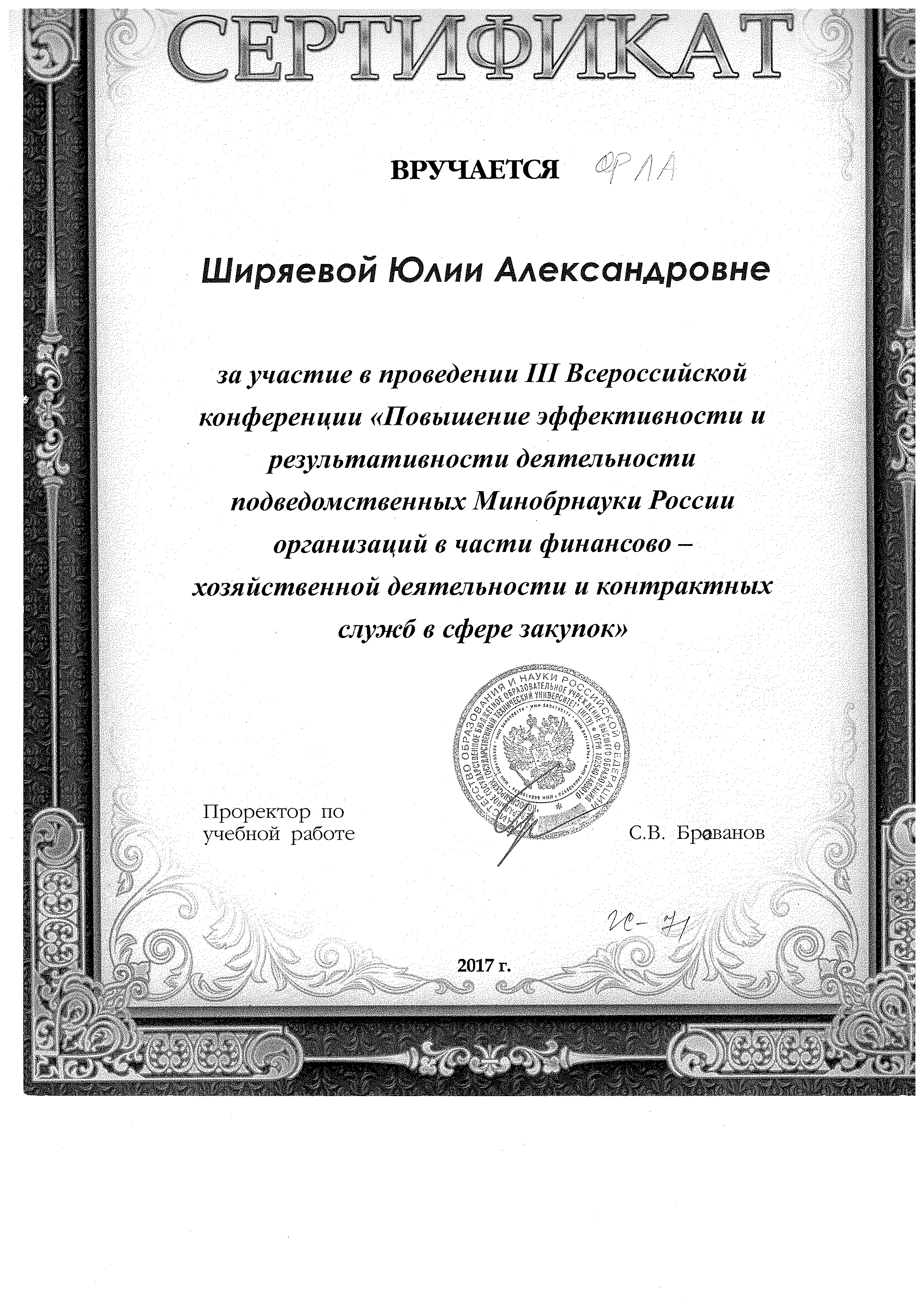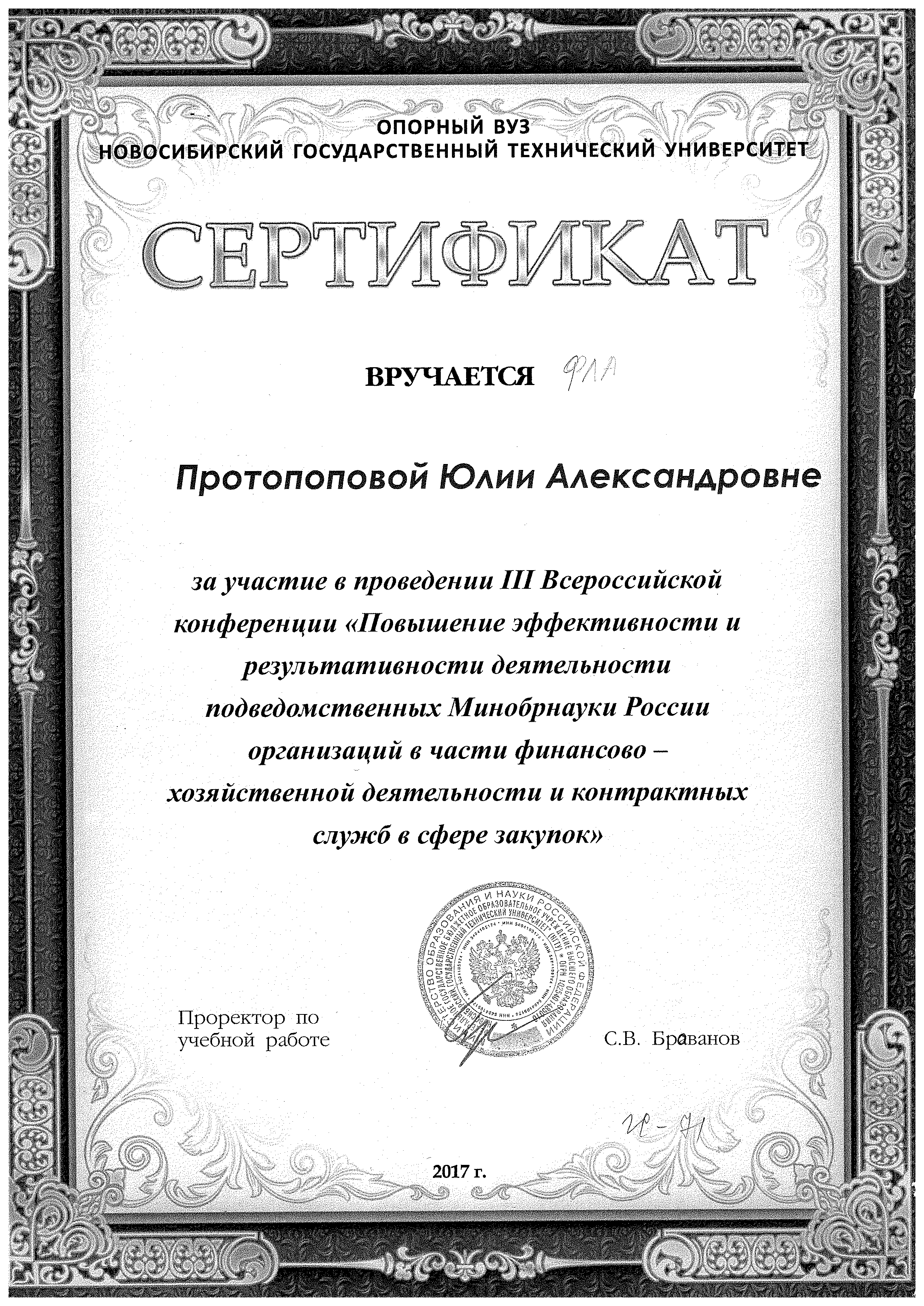 Студентки группы ГС-71 Протопопова Юлия и Ширяева Юлия получили сертификаты за участие в проведении 3 Всероссийской конференции "Повышение эффективности и результативности деятельности подведомственных Минобрнауки РОссии организаций в части финансово-хозяйственной деятельности и контрактных служб в сфеое закупок".