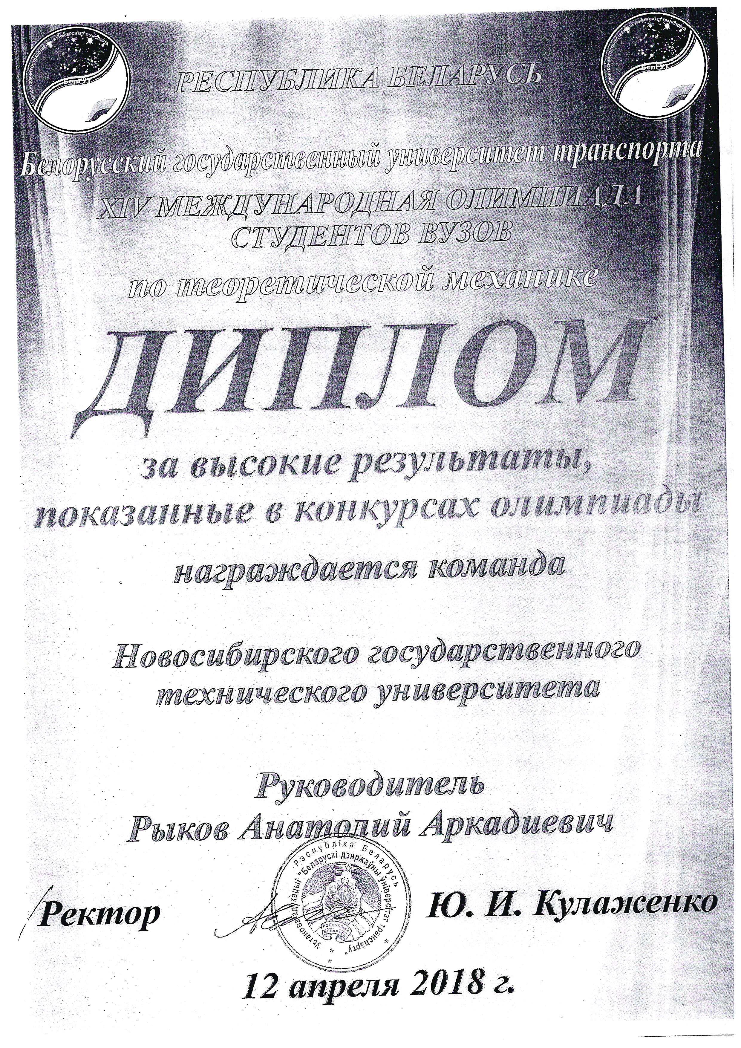 Команда НГТУ принимала участие в олипиаде по теоретической механике и получила диплом за показанные высокие результаты.