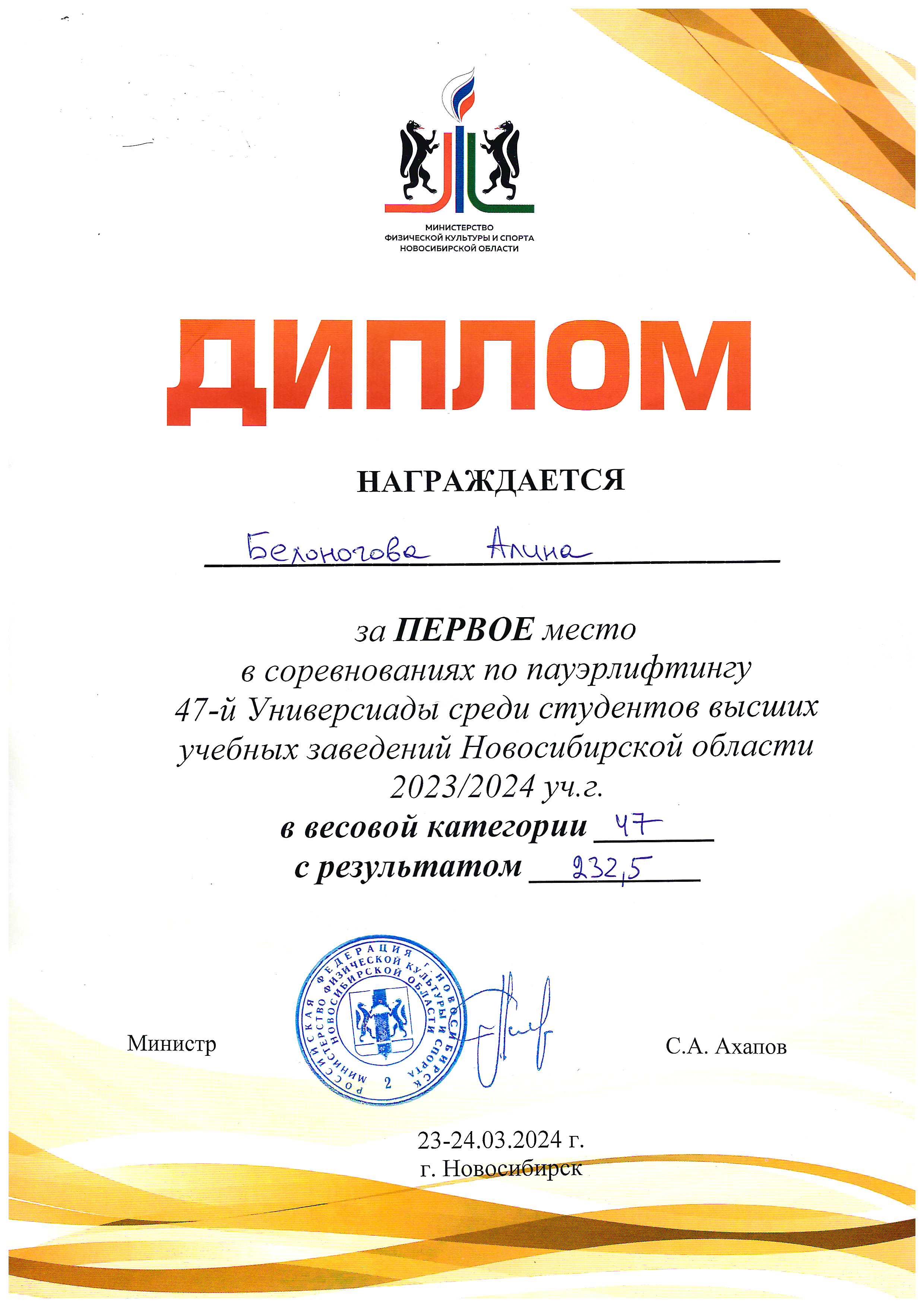 Белоногова Алина заняла первое место в соревнованиях по пауэрлифтингу на 47-й Универсиаде среди студентов высших учебных заведений Новосибирской области.