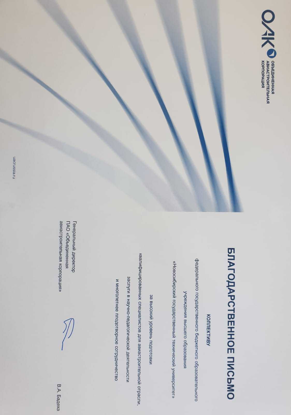ОАК (объединенная авиастроительная корпорация) прислала Благодарственное письмо колеективу НГТУ за высокий уровень подготовки квалифицированных специалистов для авиастроительной отрасли.